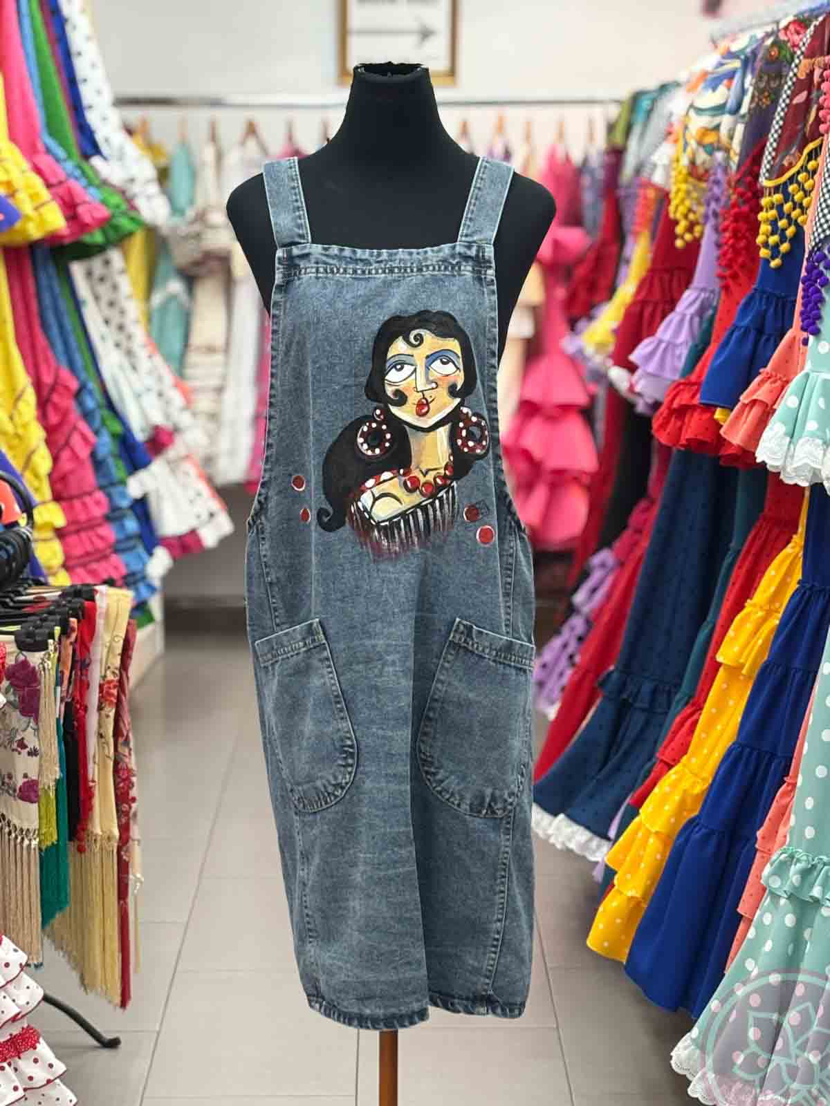 Delantal confeccionado con tela vaquera pintado a mano por la artista sevillana Carmen Encinas.