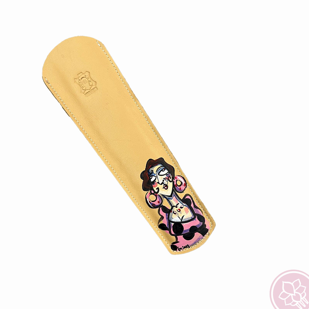Funda para abanico crema, de piel de Ubrique, pintada a mano por la artista sevillana Carmen Encinas.