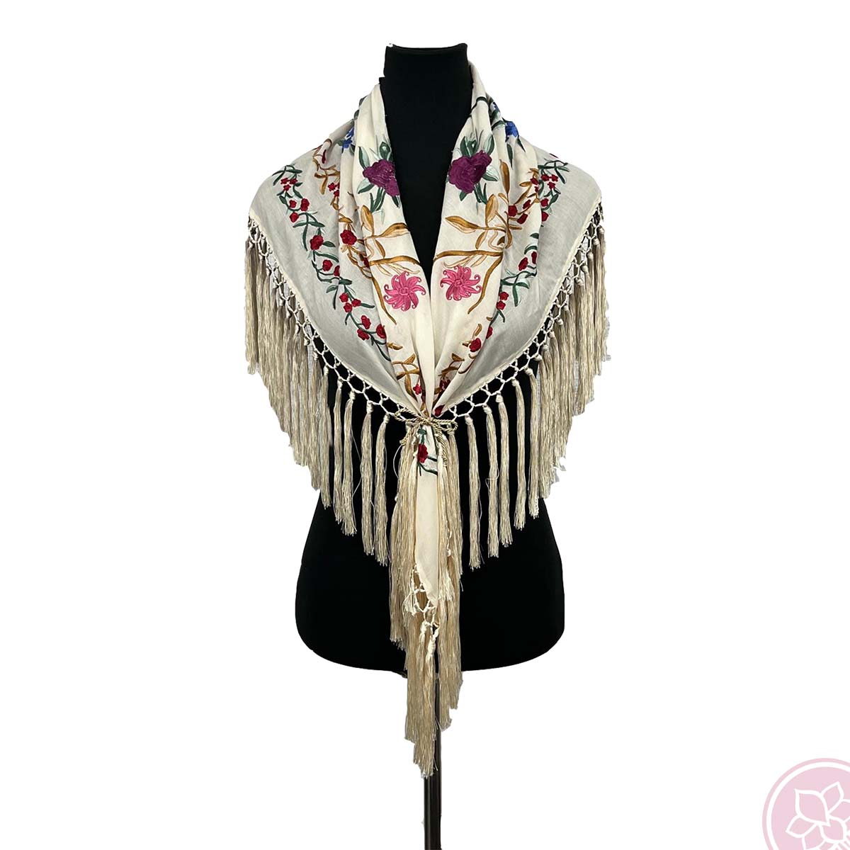 Mantoncillo en color crema, bordado y flecado a mano, de la casa Sevillana Flecos.