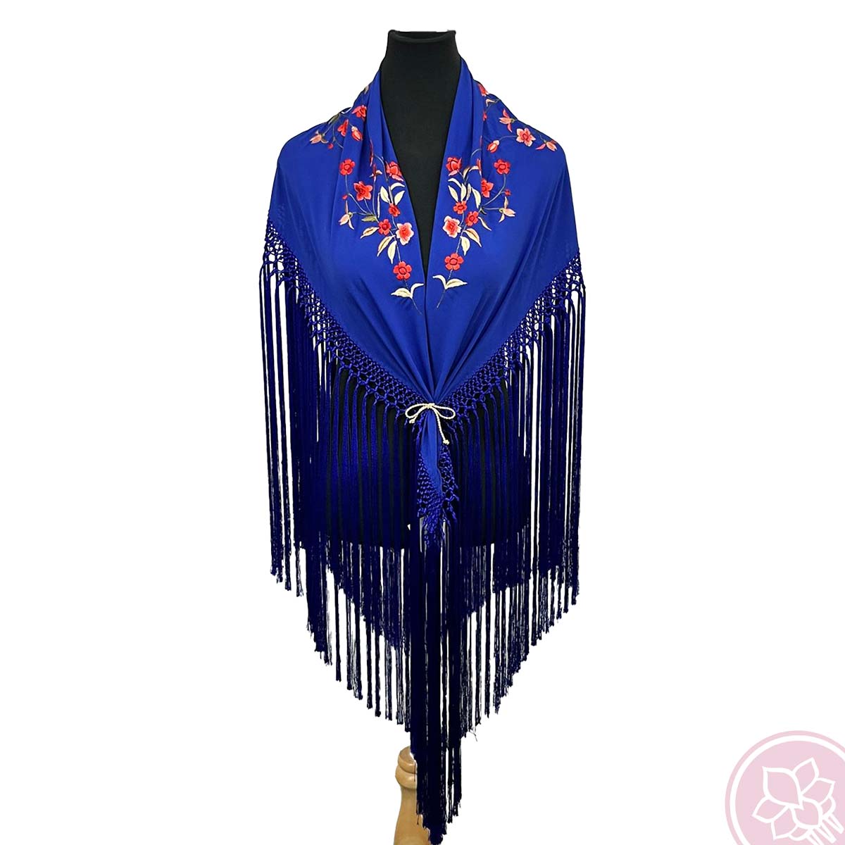 Mantoncillo de flamenca azulino bordado con flor en coral.